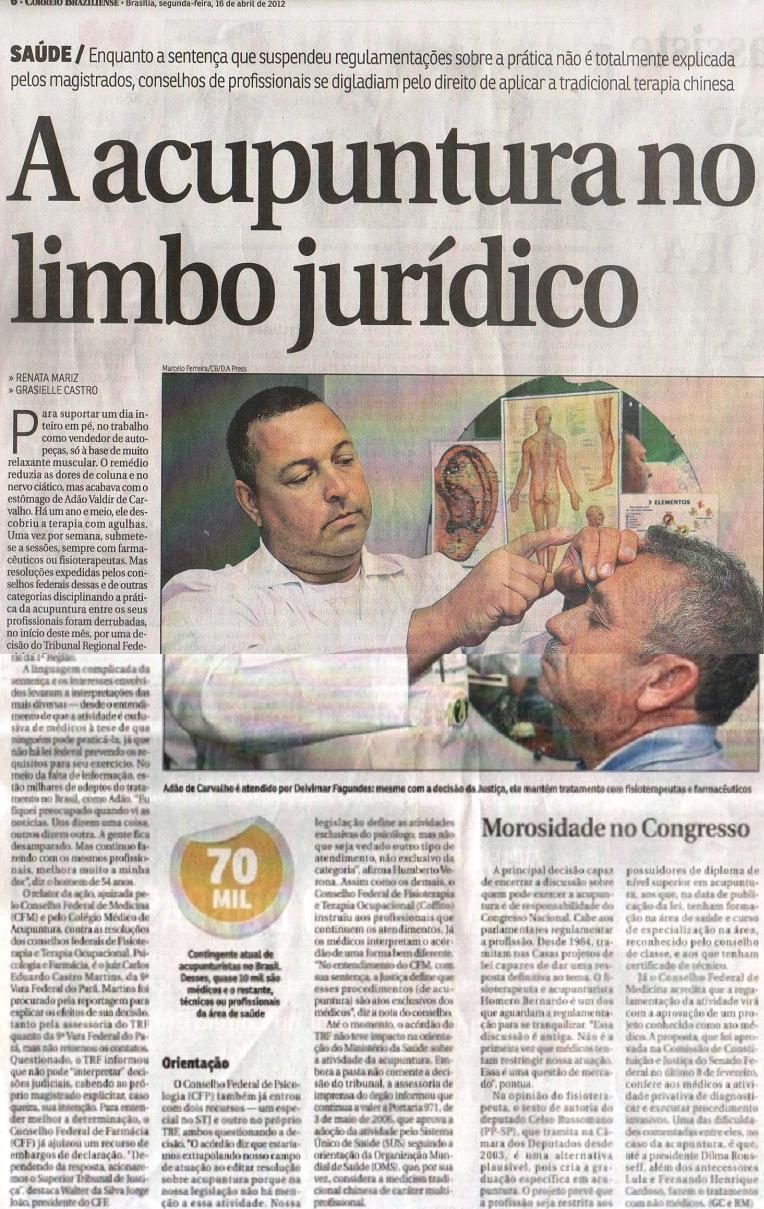 O paciente senhor Adão identificado em destaque na matéria do Correio Braziliense edição de hoje (16/04/2012) é assistido pelo Projeto Acupuntura Solidária, desenvolvido em Brasília entre convênio de cooperação mútua da SOBRAFISA e Instituto  de Pós Graduação –IPGU.